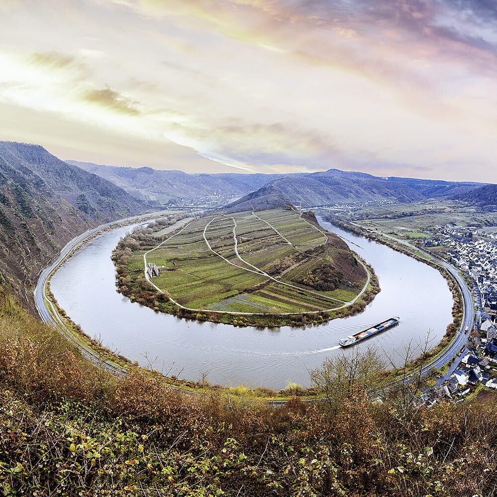 Von Trier geht es nach Koblenz, eine der ältesten Städte Deutschlands. Das weltbekannte Deutsche Eck mit dem Kaiser-Wilhelm-Denkmal gehört zum Weltkulturerbe und steht auf der Liste der Sehenswürdigkeiten ganz oben. Dort gehen die beiden Flüsse Rhein und Mosel ineinander über. An der Uferpromenade können Sie herrlich flanieren und anschließend mit der Seilbahn hoch zur Festung Ehrenbreitstein fahren. Von dort hat man einen besonders schönen Blick über ganz Koblenz. Rund um den Görresplatz in der Altstadt gibt es etliche gemütliche Cafés. Hauptattraktion auf dem Platz ist die Historiensäule, ein Brunnen, der eindrucksvoll die 2.000-jährige Geschichte der Stadt erzählt. Zu den weiteren Highlights in der Altstadt zählen die Vier Türme in der Marktstraße. Vier Häuser mit ihren kunstvollen Erkertürmen stehen an einer Kreuzung einander gegenüber. Jedes von ihnen hat eine einzigartige Geschichte aufzuweisen. Wer noch Zeit hat, sollte eine Burgenrundfahrt auf dem Rhein unternehmen. Sie führt an zahlreichen Burgen und Schlössern vorbei, darunter Schloss Stolzenfels.