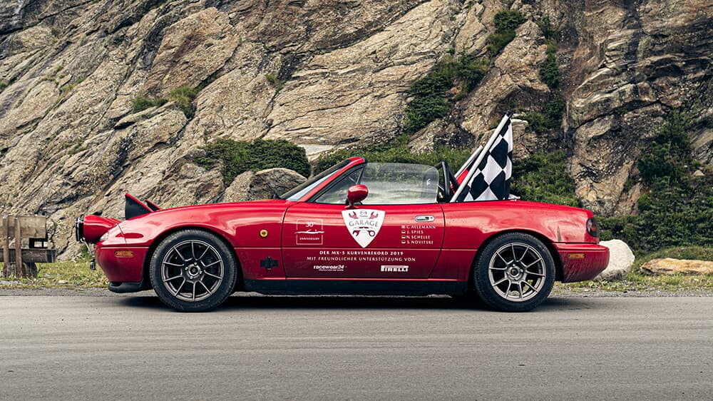 Anlässlich seines 30-jährigen Jubiläums stand der Mazda Miata, wie der MX-5 in den USA heißt, wieder im Rampenlicht und peilte einen neuen Rekord an. Ein MX-5 der ersten Generation wurde zwölf Stunden mit dem Ziel gefahren, den Rekord der meisten in dieser Zeit absolvierten Haarnadelkurven zu brechen. Und zwar auf der Kaunertaler Gletscherstraße, einer Panoramastraße zum Kaunertaler Gletscher in Österreich. Am Steuer wechselten sich Rennfahrerin Cyndie Allemann, MX-5 Cup-Pilot Jan Spiess, Auto Bild-Testfahrer Stefan Novitzki und Rallyefahrer Niki Schelle ab, streng überwacht vom Hamburger Rekordinstitut für Deutschland. Nach zwölf Stunden war mit insgesamt 2.900 zurückgelegten Haarnadelkurven die Mission er-füllt. Der bisherige Rekord wurde um mehr als 1.400 Haarnadelkurven übertroffen.