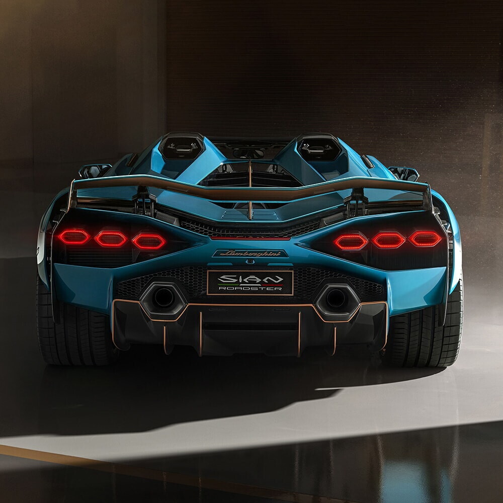 Für nur sehr wenige ist er ein (wahr gewordener) Traum: Das liegt nicht an einem abschreckenden Preisschild, sondern an einer Entscheidung bei Lamborghini. Vom neuen Sián Roadster werden nur 19 Exemplare produziert, und jedes davon ist bereits reserviert. Was für ein Erfolg für das im September 2019 vorgestellte erste Hybrid-Supersportcabrio von Lamborghini. Es verfügt über die weltweit erste Superkondensator-Hybrid-Technologie und profitiert vom Einsatz einzigartiger Materialkombinationen. Die Karosserie zeichnet sich durch die schöne Linienführung sowie durch Elemente aus, die sofort ins Auge fallen: Die Y-förmigen Scheinwerfer, die enormen Lufteinlässe an den Seiten und am Heck, wo beide hochgezogenen Auspuffrohre ein optisches Highlight bilden, die sechseckigen Rücklichter (inspiriert von jenen des Lamborghini Countach aus dem Jahr 1974) sowie der Heckspoiler, der sich je nach Geschwindigkeit des Fahrzeugs automatisch hebt oder senkt.
