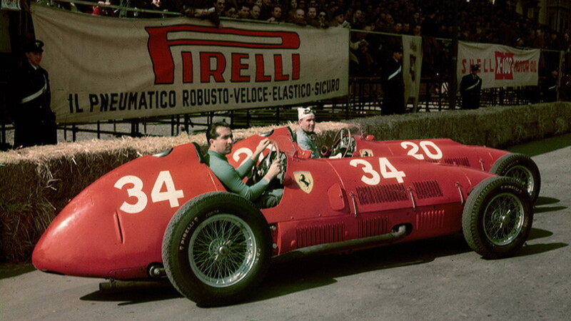 Drivers Alberto Ascari and Nino Farina on Ferrari 375 equipped with Pirelli tires at the Valentino Grand Prix, 1952