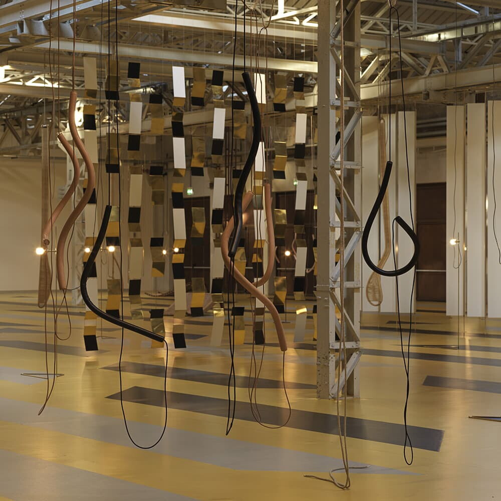 Other works that contribute to consolidating the narrative conceived for the exhibition at the Pirelli HangarBicocca are a series of hanging and modular sculptures made in black-, green-, ochre-, white- and gold-painted brass which introduce the exhibition route (alterated climbing form I, II, III, IV, 2017), inspired by a small 1954 relief, Climbing Form, by the British artist Mary Martin (1907-1967). Lastly, an allusion to Post-Minimalist art, especially to the work of the artist Eva Hesse (1936-1970), is evoked in in alterated knot, 2018, abstract sculptures in leather and rope directly hanging down from the ceiling—and alluding to the designs of Annie Albers.