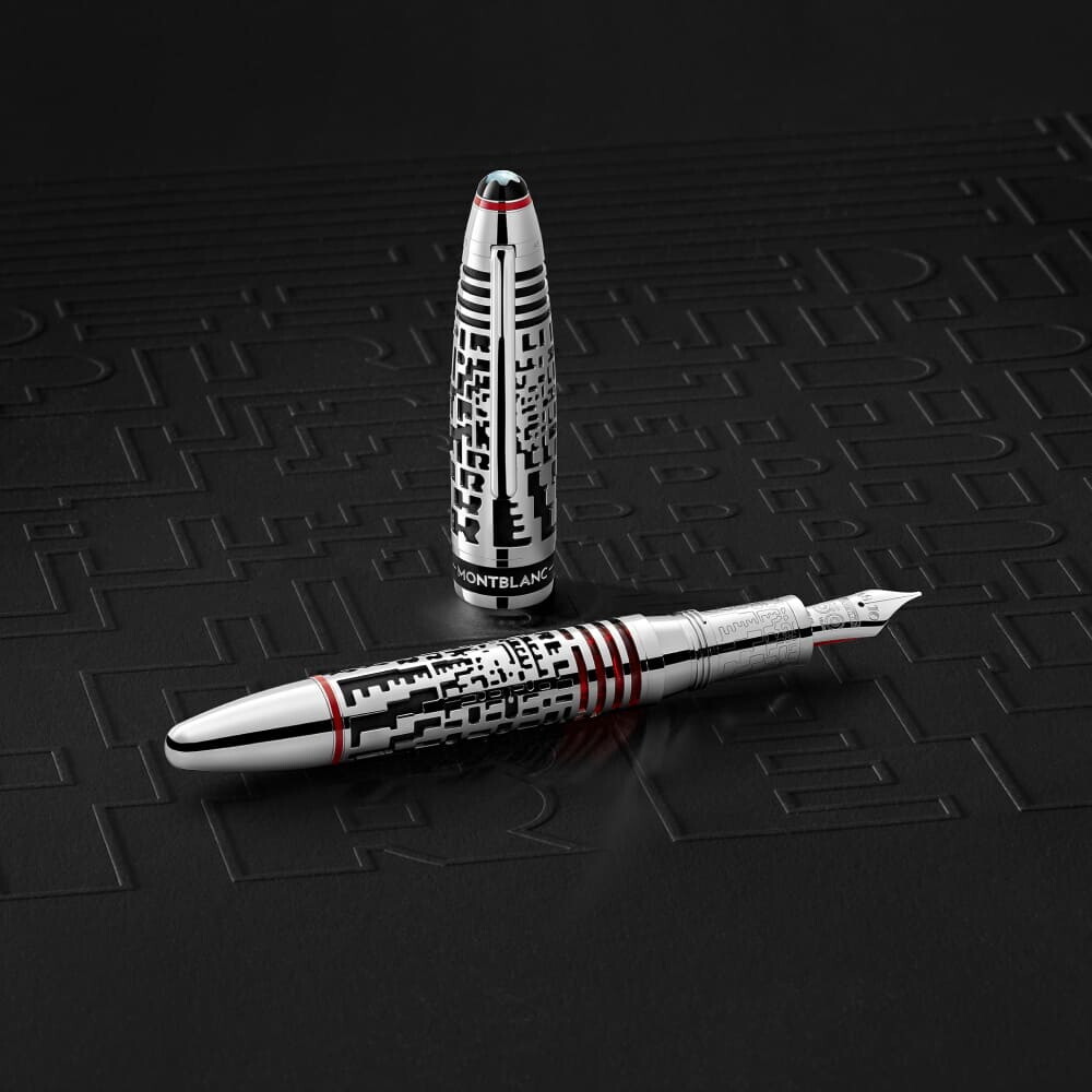 The Meisterstück Great Masters Pirelli Limited Edition 72 blends the luxury and elegance of Montblanc with the fame of Pirelli. The black rubber surface, in fact, visible through the Au750 solid white gold skeletonisation on the cap and the body, carries with it the history of racing, containing pieces of genuine Pirelli competition tyres. The Limited Edition 72 skeleton overlay is crafted in solid white gold. Crowning the top of the cap, the Montblanc emblem is painstakingly captured in brilliant mother of pearl.