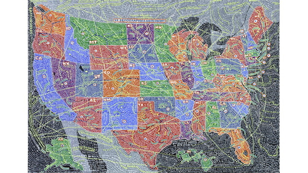 A map is always an approximation and artists try to emphasize this arbitrary nature, using them to tell a story about their perception of time and space, persuading us to change ours. Scher's maps are both an attempt to take control over the complexity of territories, and a way of addressing and exploring this complexity in greater depth. Her preparatory process literally digs deep as she works on many different maps' sources at once. In fact, a single map can take her six months to finish: “I combine information to create a different way of looking at things, so you might look at distance against population or geography against demography.”