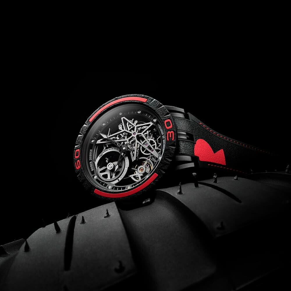 Excalibur Spider Pirelli shows what happens when the finest minds from different industries come together to share their unrivalled know-how, breakthrough research and boundless creativity. With a caliber that includes Roger Dubuis' first automatic skeleton, the transparent view of its self-winding movement is held directly on the inimitable Roger Dubuis star. Brimming with racing design codes, the inner design of the strap displays the recognizable Pirelli Cinturato™ Intermediate pattern and the additional color kits are thicker than the base bezel to mirror the look and feel of the distinctive Pirelli tires, those that roar on their way to the finish line.
