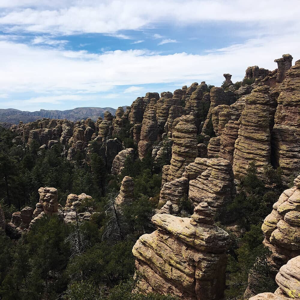 It was late when we set off from Los Angeles for Arizona's Sky Islands, an ancient geological phenomenon that formed when, 27 million years ago, a massive vol-canic eruption covered the area in ash. Slowly over centuries, the sun, wind and especially the seasonal heavy rains and flash floods have eroded the ash, leav-ing behind the beloved hoodoos, or “standing up rocks”, as the Chiricahua Apache people called these thin towers of stone that protrude from the earth. This isolated “mountain range” is unique for many reasons – its history, geology and also rare biodiversity that has coaxed some species of plants, animals, birds and bugs all the way from South America. The area is like a city of its own; the hoo-doos like skyscrapers housing the more than 300 different species of birds. The trees and shrubs like humble homes for the land-bound animals and bugs. The trails like roads worn down by their citizens – bears, mountain lions, armadillos and the occasional visitors like my sister and me. This is the kind of city we've come back around to feeling at home in.