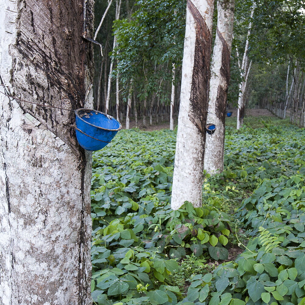 Today in Indonesia very many families, around 2 million, work on cultivation of the natural rubber tree and have based their sustenance on this now for generations. Families of growers, small local producers, owners of small plots of land where the Hevea Brasiliensis is born and grows. The farmers play a leading role in our tale of sustainability. Theirs is a very delicate task which requires great care. To be a good farmer a grower necessarily has to have a mix of experience and precision in every smallest movement. Only in this way can a product of top quality be obtained, suitable for processing. This operation is called “tapping” and consists in stripping away the bark, using a special tool, extremely delicately, so as not to damage the tree and keep its productivity high, seeking to avoid possible contamination which would have a negative influence on the quality level of the product. The great care taken during the carving phase plays an essential part also in safeguarding the trees: if cut badly, their health suffers and their productivity decreases radically. If the work is carried out according to all the rules, however, the health of the tree and of the surrounding environment is safeguarded. When a tree is carved badly, it becomes unproductive for the farmer and the risk of it being abandoned is high, leading to further deforestation to make room for new plantations of Hevea Brasiliensis, often impacting local biodiversity. The farmers' work has recently been made even more difficult by the lowering of the market price of natural rubber, a problem which has affected this industry for some time.