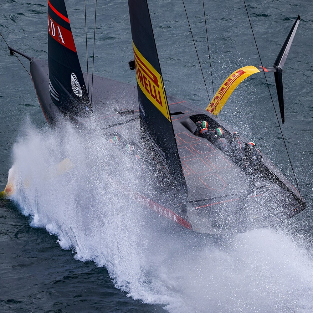 These boats can travel at speeds in the order of 40 knots upwind and 50 knots downwind. Designed in a joint study by defender Emirates Team New Zealand and the record-breaking challenger Luna Rossa Prada Pirelli, the AC75 class rules can be summed up in a few numbers: an overall length of 22.70 metres, including the bowsprit; a beam of 5 metres; 6.5 tonnes in weight; 26.5 metres of mast height from the deck; 225-235 square metres of sail area, including the mainsail and the jib (plus 200 square metres of the Code Zero). The Luna Rossa Prada Pirelli was made of carbon fibre and aluminium by Persico Marine, based in Nembro (Brescia, Italy).
