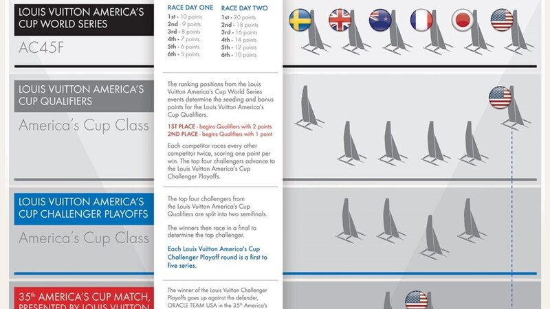 After the elimination stage only four teams go through to a play-off, while the defender goes directly to the final. The play-offs consist of two semi-finals and one final, with the winner going on to challenge Oracle Team USA. Regulation note: if the team which wins the initial round reaches the final of the America's Cup, it starts with a one point advantage in terms of races won. The first team to reach seven points will be declared the winner of the 35th edition of the America's Cup.
