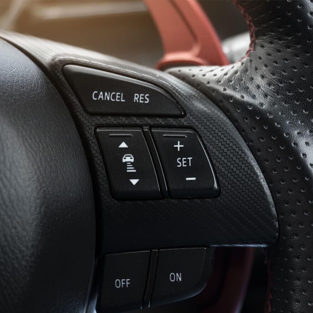 Today, cruise control works by acting on the throttle, a vital part of the engine that regulates the amount of air that can enter the combustion chambers. It is operated by an electric motor controlled by the engine control unit: when the latters sends information on the degree of pressure of the accelerator pedal, the throttle opens or closes – the injector is simultaneously opened to let in the right amount of petrol – and this affects the amount of air introduced into the combustion chambers, and consequently the engine rotation and ultimately the speed of the car. This means that though cruise control works mechanically, the driver manages the system through electronics: when the desired cruising speed is reached, you simply press a button (usually with the word SET) and the car maintains the set pace. To change the speed, the driver has to press the + and – buttons next to the SET button. Cruise control works until you press either the accelerator pedal again, or the brake or clutch pedal, when it is then deactivated.