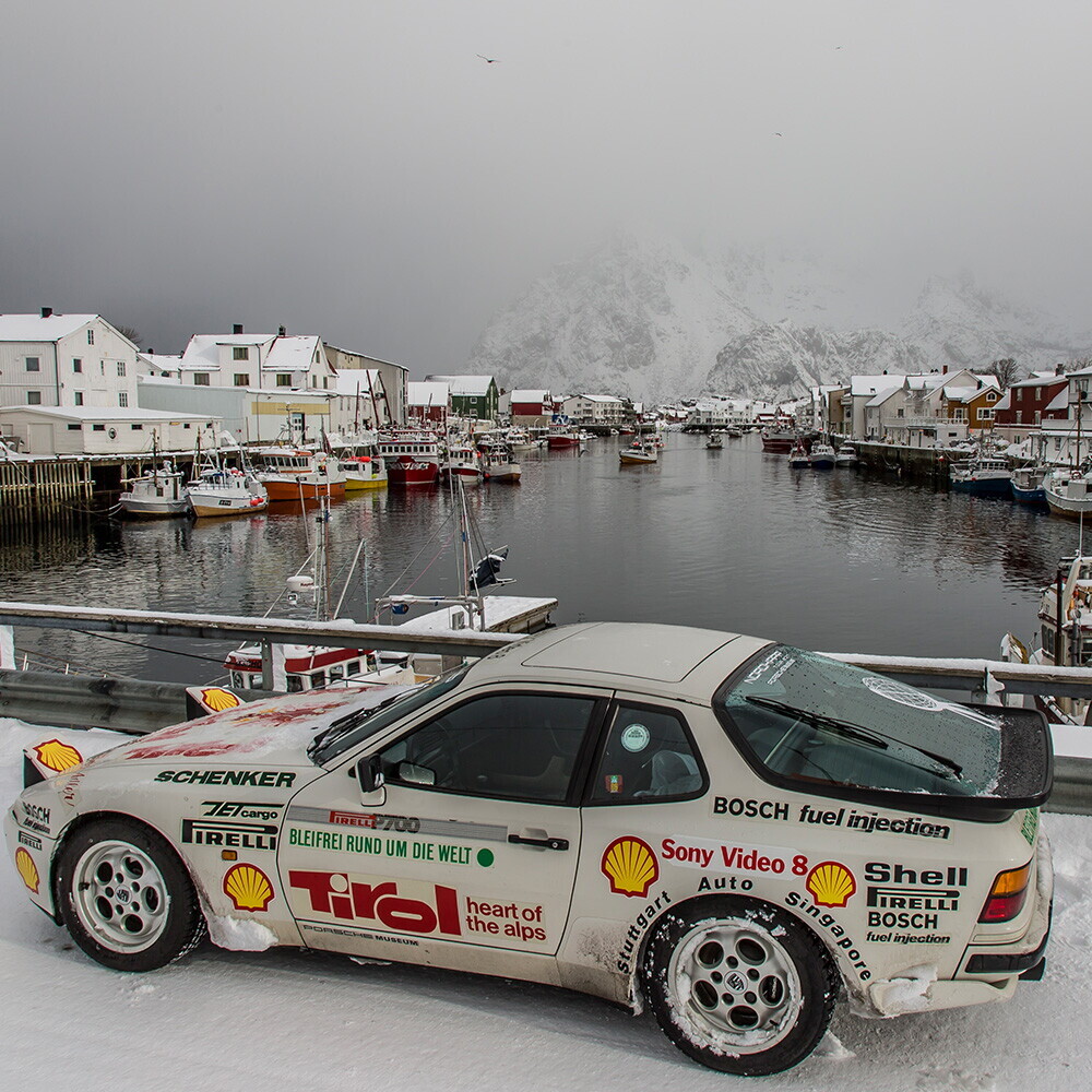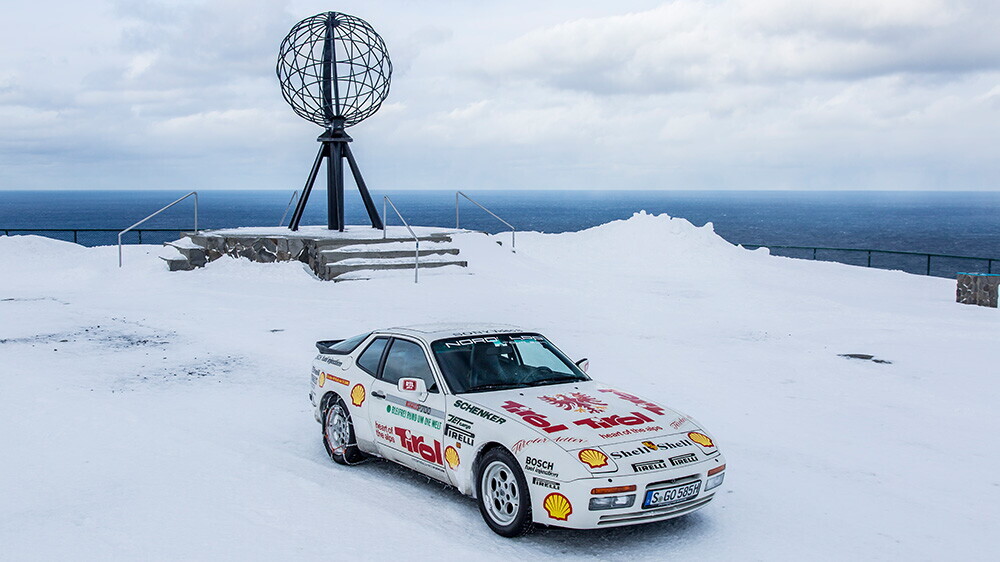 Even three decades later, the road through Northern Scandinavia is still no cakewalk. Especially since the globetrotter Porsche 944, with which the Austrian Gerhard Plattner drove around the world 31 years ago, is an automotive treasure that should not be parked in a piles of snow underneath which a stone possibly hides. The fact that the "Tyrolean eagle", that's the name of the white vehicle, which with its many stickers looks like a rolling advertising pillar, is constructed according to the transaxle principle - i. e. engine at the front, transmission at the rear - does not make things any easier for the driver on a snow-covered road.