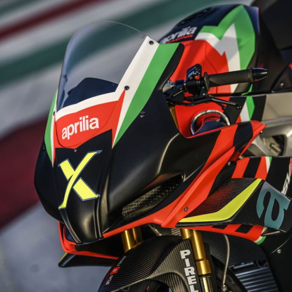 Aprilia Racing focused on light-weight materials to make this celebratory version a featherweight 165 kg: for instance, the same tank - but lighter - as the Aprilia RS-GP or the carbon fairing embellished with graphics inspired by the livery of the model which competed in the Moto GP 2019 world championship.