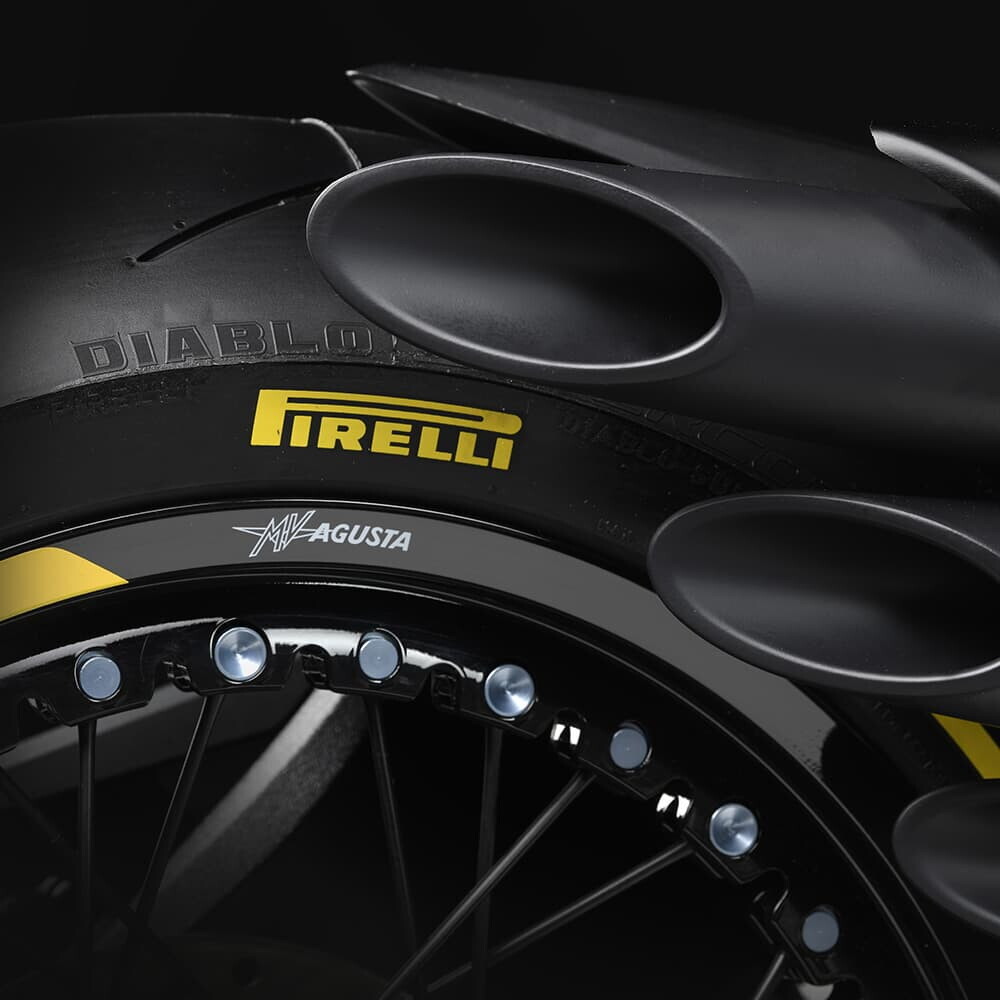 But this time Pirelli Design the incubator of high-end projects with a vocation for the most innovative challenges, has gone further than in past creations: as well as targeting aesthetics it has also set out to enhance the functional aspects of the bike. One glance at the fuel tank slider and the top fairing is evidence of this. For these two components the Pirelli Research and Development department has developed a special rubber that ensures better resistance to scratches and friction as well as to atmospheric and chemical agents like fuel. The iconic and distinctive Diablo flash symbol is also imprinted on the saddle, in a double texture with contrast stitching specially created by Centro Ricerche Castiglioni, and the tail section has been refined by Pirelli Design. If it's true that excellence is hidden in the particulars, here MV Agusta and Pirelli Design reaffirm their constant attention to detail: even the finish on the exhaust silencer terminals is unique, achieved by applying a special ceramic-based paint than can withstand very high temperatures.