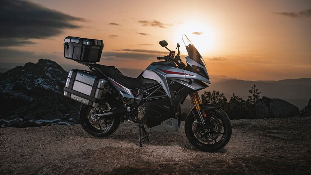 Maxi enduro bikes are powerful, quite charming but certainly not relaxing to manoeuvre and drive off-road. They have large displacement engines (a 1,000 cc is now an average), a very rich set-up with bags, trunks, fairing, engine bars and countless accessories. The result? Easy to exceed 250 kg, weight we find in our electric protagonists: The Energica Experia weighs 260 kg, the Zero Motorcycles DSR/X 247 kg.