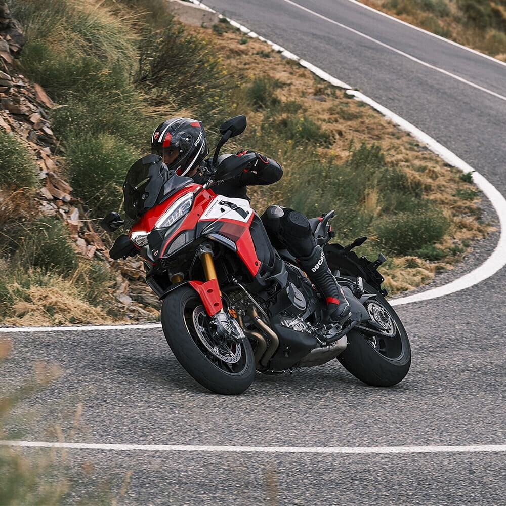 The substantial difference with the standard Multistrada comes from the cycling sector, developed around the 17” rim at the front. The original equipment includes Pirelli Diablo Rosso™ IV tyres, with a sporty allure, which afford maximum performance levels on the road, both on dry and wet surfaces, and are fitted to Marchesini aluminium forged rims, which are lighter than those on the Multistrada V4 S. The Öhlins Smart EC 2.0 suspension is also making its début on a model from the Multistrada family, enhancing the performance in the auto sports ride mode by adapting to the rider's particular driving style. The braking system is also top of the range.