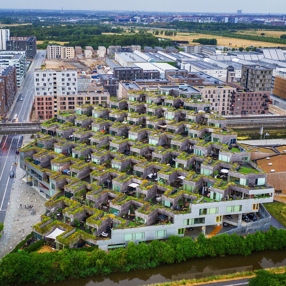 Comme on peut le lire dans un article approfondi de la revue Dezeen, Copenhague a construit au cours des dernières années de nombreux espaces publics et bâtiments éco-conscients et résilients au climat : ce n'est pas par hasard qu'elle a été choisie pour accueillir le Congrès mondial des architectes de l'UIA en juillet 2023, dans le but d'organiser un plan pour aider l'architecture à atteindre les objectifs du développement durable d'ici 2030. Un symbole de cette nouvelle façon d'interpréter l'urbanisme est certainement l'Amager Bakke, ou CopenHill, définie comme l'usine la plus propre du monde pour la transformation des déchets en énergie. Conçue par le studio Big (groupe Bjarke Ingels), elle comprend une piste de ski et le plus haut mur d'escalade du monde rattaché à l'usine de conversion de la biomasse. En outre, il existe de nombreux autres projets moins emblématiques, mais dont les aspects environnementaux et sociaux sont plus évidents, comme le Klimakvarter à Østerbro, aujourd'hui le quartier le plus vert de Copenhague, qui a été révolutionné afin de s'adapter complètement à la crise climatique et de devenir un modèle à reproduire dans le reste de la ville au cours des prochaines années. Alimenté par des énergies propres et enrichi d'espaces verts, la véritable nouveauté du Klimakvarter (littéralement quartier climatique) est qu'il sera capable de résister aux fortes pluies et aux inondations, malheureusement de plus en plus violentes en raison du changement climatique.