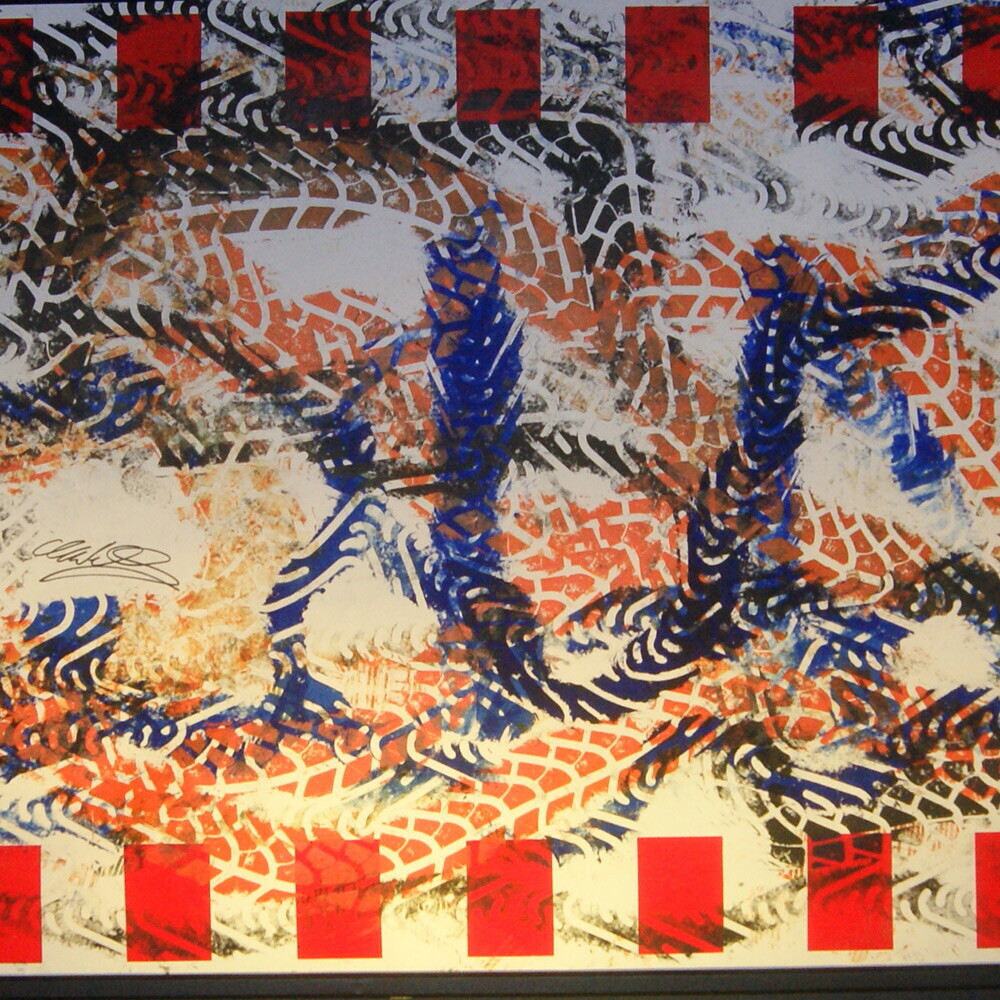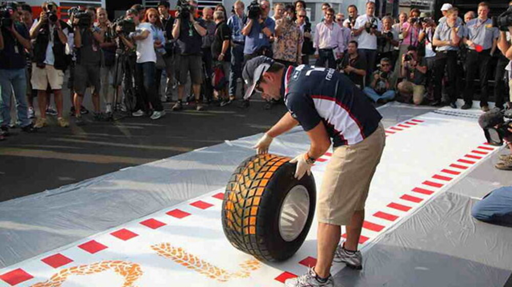 Alcuni degli pneumatici Pirelli da bagnato ed intermedi sono stati ‘inchiostrati' e utilizzati come rulli su un grande foglio di carta di 10 metri nel paddock. A cinque piloti è stato chiesto di passare gli pneumatici da Formula Uno sulla ‘tela vuota', sotto la supervisione artistica di Dickens.