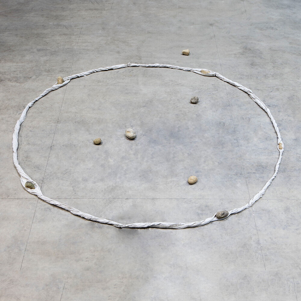 Kishio Suga invita a capire la sostanza del materiale e a percepirlo in maniera intuitiva, senza sovrastrutture. La sua esposizione è una sorta di giardino zen, composto da objets trouvés: rami, rametti, tronchi, spaghi. Sembrerebbe quasi il nido di un uccello. Tutte le cose – nella mostra come nel cosmo, nella mostra che è metafora del cosmo e traduzione di una sensibilità di percepirlo – sono in relazione le une con le altre; tutte le cose esistevano già ed esistono ancora. La sua intenzione e la sua non-intenzione, la sua espressione e la sua non-espressione formano una linea di confine estremamente critico. Sta allo spettatore definire questo confine. Le cose parlano, lo spettatore le ascolta.