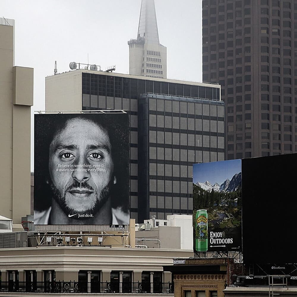 Colin Kaepernick è un giocatore di football americano, ma non trova un ingaggio da due anni. Nel 2016 aveva deciso di inginocchiarsi durante l'inno nazionale pre-partita in segno di protesta contro la violenza della polizia nei confronti delle minoranze etiche. Nike lo ha scelto per la sua recente campagna pubblicitaria dal messaggio molto chiaro: "Believe in something, even if it means sacrificing everything. [Credi in qualcosa, anche se significa sacrificare tutto.]"