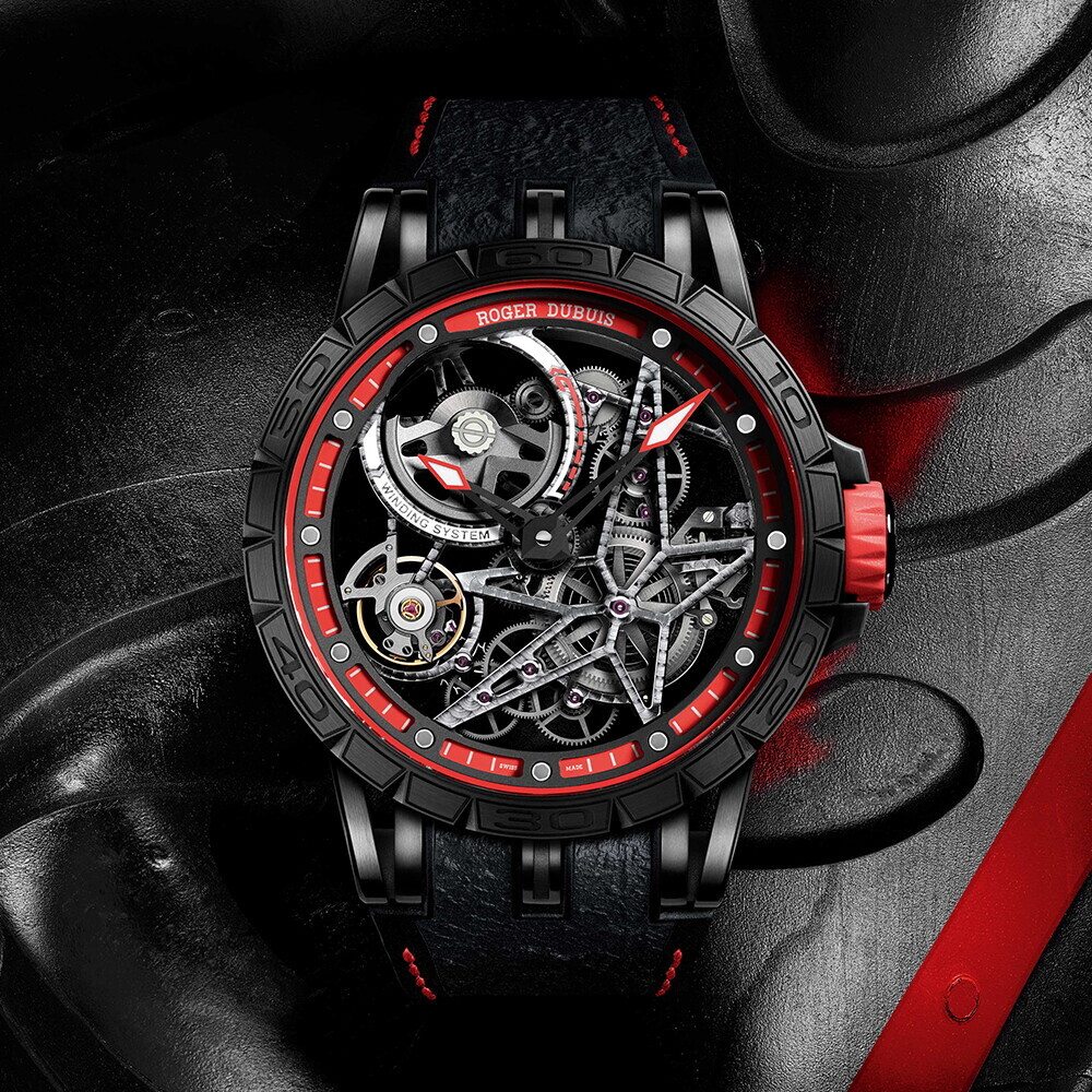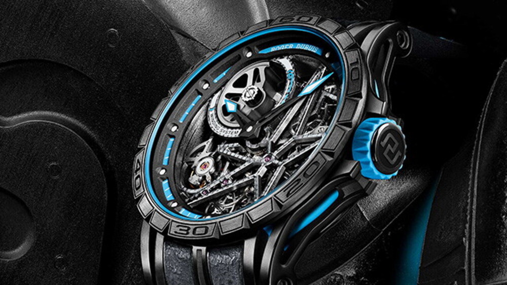 Contraddistinto da un réhaut scheletrato nero e blu, rosso o giallo, il codice colore di questi nuovi dinamici modelli Excalibur Spider Pirelli è ulteriormente accentuato da una corona di titanio con rivestimento DLC nero sovrastampata, con cuciture abbinate sui cinturini.