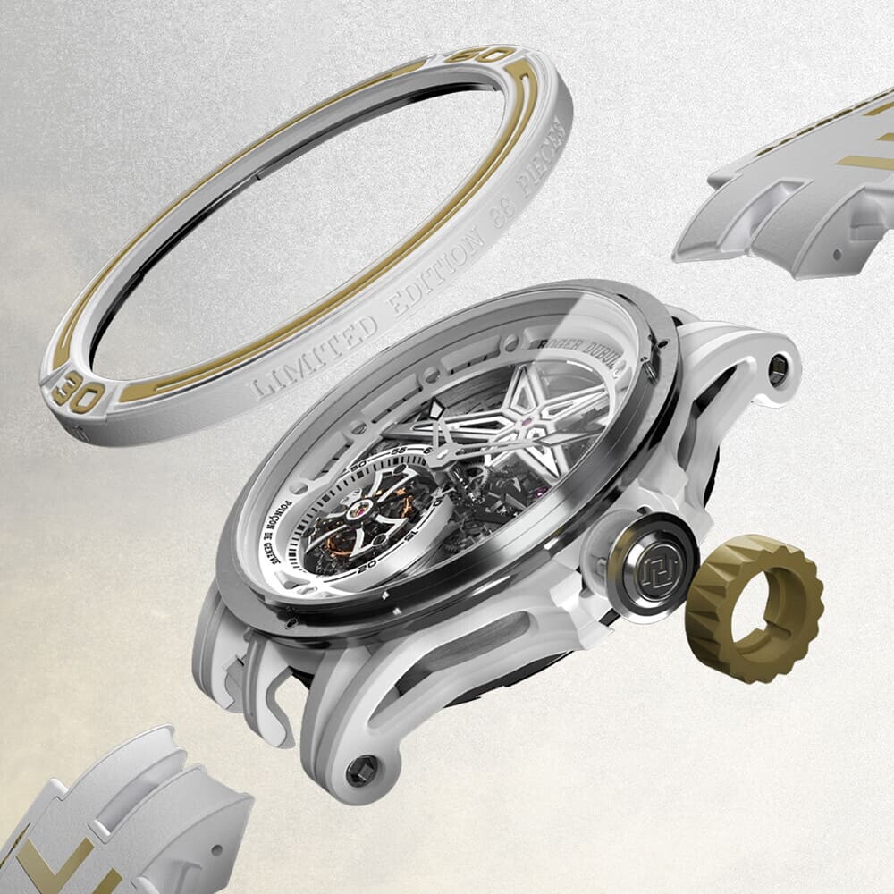 «Excalibur Spider Pirelli Monotourbillon è una manifattura innovativa che parte dal tourbillon volante, la complicazione regina di Roger Dubuis, con una cassa realizzata in composito di fibra di silicio, di colore ultrabianco molto trendy. Con Pirelli abbiamo scelto le tre lunette diverse di colore rosso, argento e oro per celebrare l'anniversario. Resta la similitudine con l'idea di “pitstop”: come si sostituiscono le gomme in Formula1, così si può cambiare il look dell'orologio tra corona, cinturino e lunetta, per avere quattro orologi in uno e soddisfare le esigenze di personalizzazione».
