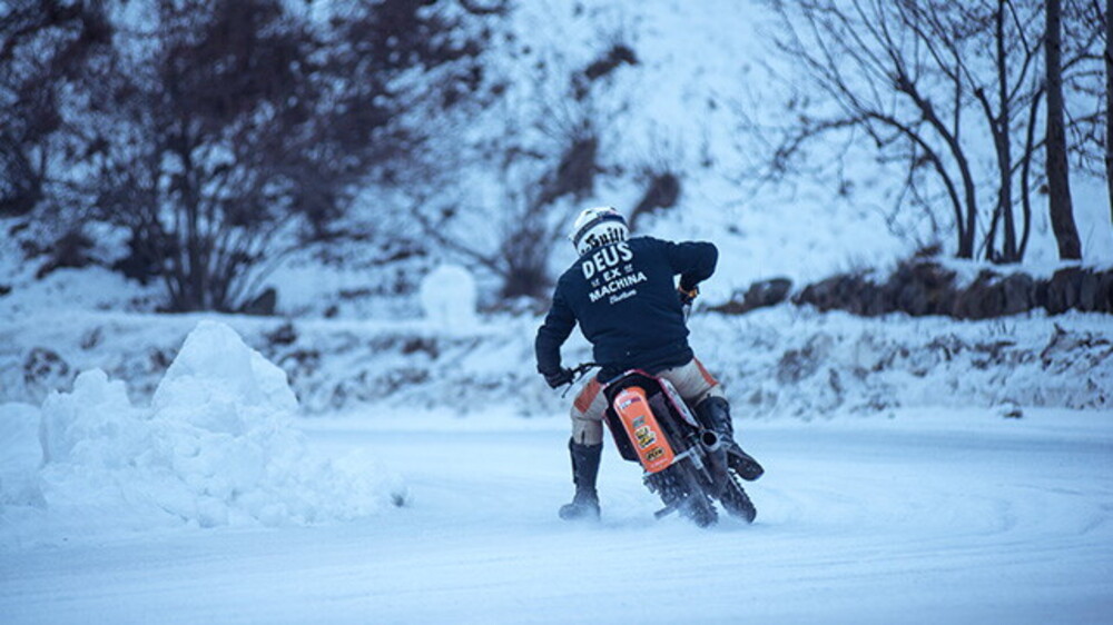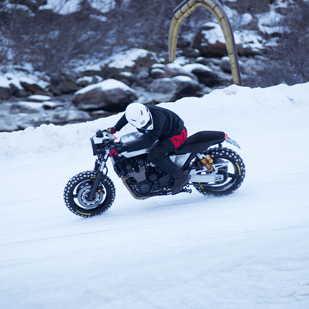 Deus Ex Machina ha allestito, con il supporto della rivista inglese Sideburn, uno spettacolo curato nei minimi dettagli. In lontananza si intravede uno dei bolidi che giace fermo in attesa di essere domato: si chiama X Project ed è una creazione dei ragazzi di Deus ex Machina che per ottenerla sono partiti dalla base di una Yamaha XJR1300Racer gommata per l'occasione con pneumatici speciali creati ad hoc da Pirelli partendo dai famosi pneumatici da off road SCORPION™ Rally. Marco Belli, Campione Italiano e Nord Americano di Flat Track, entra in pista per mostrare a tutti le sue abilità in fatto di controllo estremo. Lui è l'unico tra i partecipanti a poter domare una moto di 1300cc sul ghiaccio.