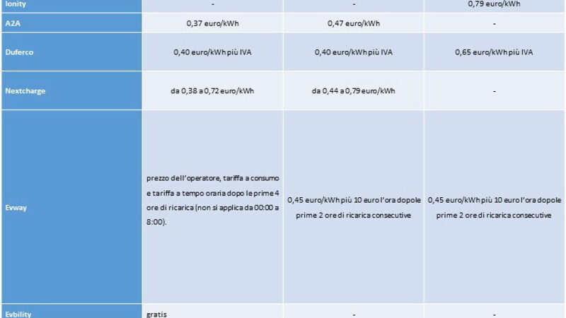 Evway offre due abbonamenti validi in tutta Europa, Ionity Europe Easy Travel a 69 euro l'anno con prezzo agevolato di 0,59 euro/kWh per 12 mesi, oppure Ionity Europe Super Save a 199 euro l'anno con costo della ricarica di 0,39 euro/kWh per 12 mesi. Altrimenti Neogy di Alperia e Dolomiti Energia propone l'abbonamento a consumo a 0,45 euro/kWh per le stazioni Quick in corrente alternata, mentre per il costo della ricarica in corrente continua è di 0,50 euro/kWh fino a 75 kW e di 0,70 euro/kWh oltre 75 kW, con roaming a 0,50 euro/kWh.