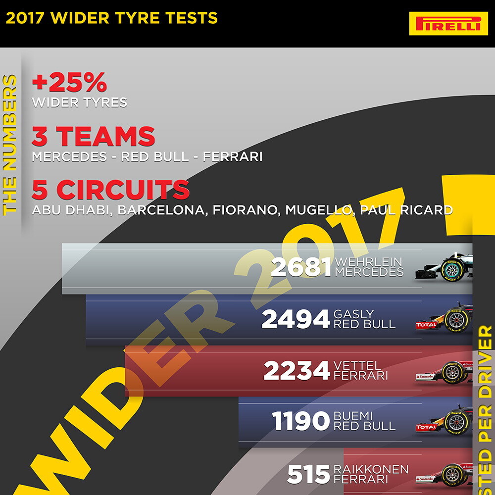 Pur offrendo un incremento di carico aerodinamico rispetto alle monoposto attualmente in pista nel mondiale, le mule cars sono ancora abbastanza lontane dalle vetture 2017, e questo influenzerà soprattutto il comportamento delle mescole. Alcune di queste, disegnate con filosofie e materiali completamente nuovi, già oggi mostrano segni positivi nella direzione del lavoro verso l'obiettivo auspicato: minore degrado e una maggiore resistenza al surriscaldamento mantenendo quindi un livello di aderenza ottimale. Ma tutti questi effetti saranno da validare all'inizio del prossimo anno e in condizioni rappresentative. Un ulteriore complicazione è stata rappresentata dal fatto che in alcune sessioni in Europa abbiamo trovato freddo e anche pioggia, limitando quindi i test.