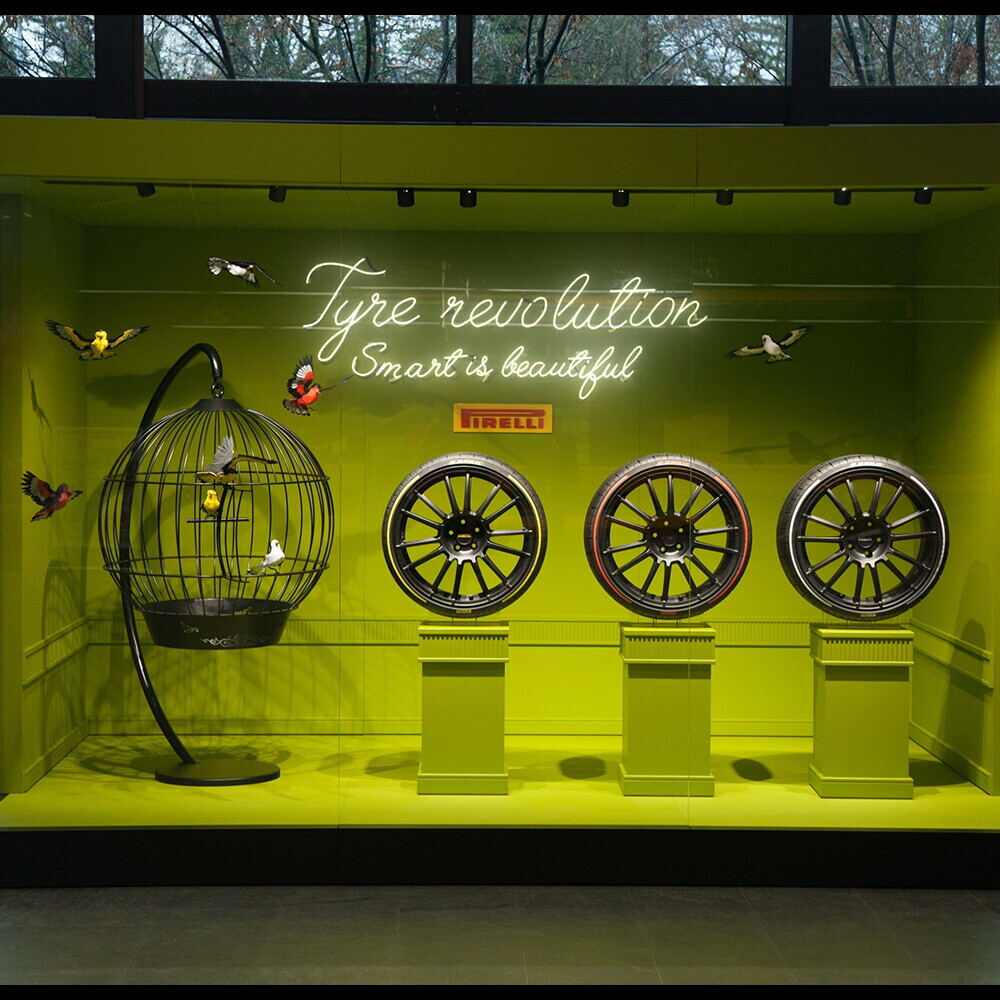 Tre pneumatici, con il fianco rispettivamente colorato di rosso, giallo e bianco, sostenuti da piedistalli a sottolinearne la preziosità, all'interno di un ambiente che riproduce eleganti boiserie. Da una voliera in ferro battuto, fuoriescono poi uccelli colorati, disegnati e realizzati in carta dall'artista e art director Carlo Urgese. Come a sottolineare che finalmente il “colore è libero”. Sull'installazione spiccano infine due scritte al neon, “Tyre revolution” e “Smart is beautiful”: messaggio evidente di un nuovo modo di concepire le gomme per auto, che d'ora in poi saranno “belle e intelligenti”. E intanto questo originale “spazio” diventa una selfie opportunity per le molte persone che in questi giorni affluiscono in città. Un semplice scatto da postare su Instagram con l'hashtag #incolor: la rivoluzione a colori è appena incominciata!