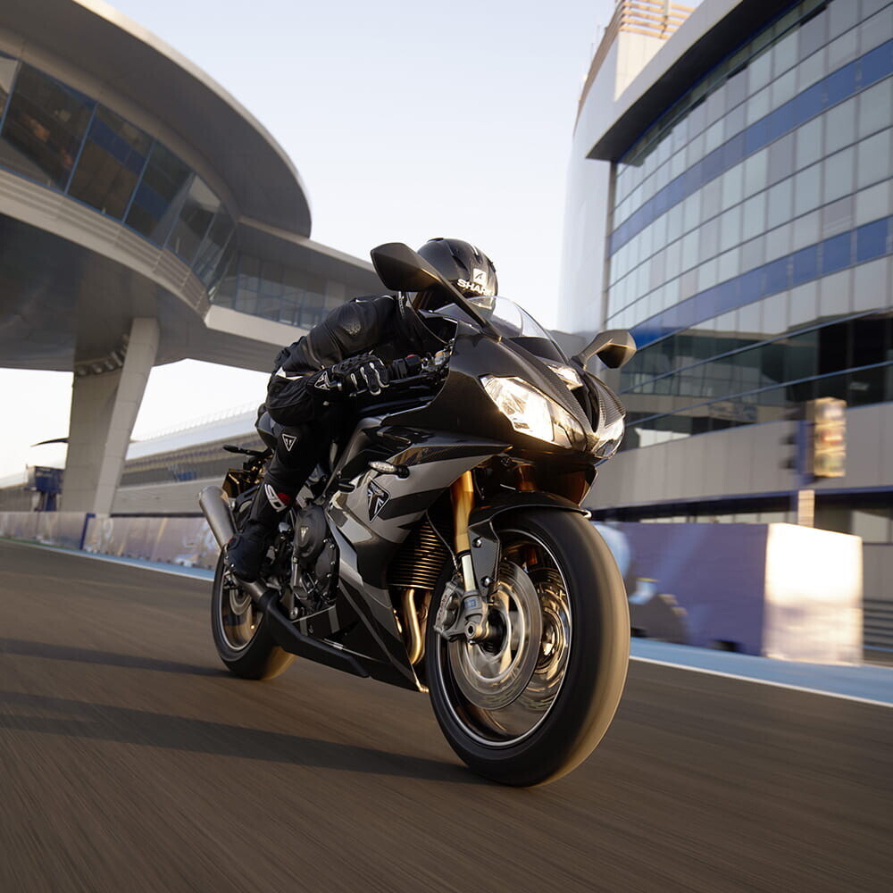 La cilindrata non cambia rispetto alle sportive Triumph di serie, ma i valori di potenza e di coppia sono i più elevati di sempre. Si parla di 130 cavalli e di 80 Nm, con la possibilità di raggiungere i 13.250 giri. Sono numeri di tutto rispetto per una moto di media cilindrata, ottenuti grazie a una serie di componenti che i progettisti hanno prelevato direttamente dai motori destinati alle competizioni, dalle valvole in titanio ai pistoni rinforzati, dalle bielle modificate al rapporto di compressione aumentato. Oltre a una lunga lista di componenti che fanno la differenza, non ultimo l'impianto di scarico in titanio, che riproduce fedelmente la tonalità di quelle del campionato.