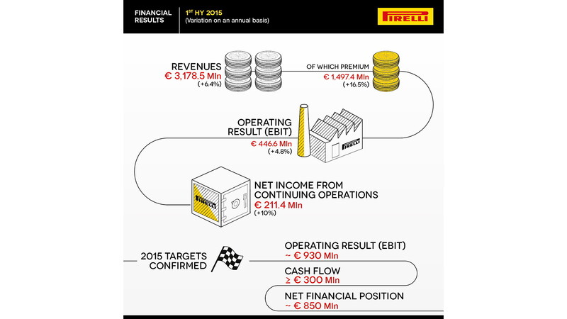 O segmento Premium, medidas eficientes, apresenta uma tendência à taxa de câmbio favorável, custos moderados de matéria-prima e aumento de preço/mix de 4,4% (como consequência direta do foco em produtos high-end e a troca de mercado, assim como aumentos de preços na Rússia e América Latina) são os principais alavancadores dos resultados da empresa. No final do primeiro semestre de 2015, as vendas líquidas da Pirelli aumentaram em cerca de 6,5%, mais de 3,1 bilhões de euros, o lucro operacional foi de 446 milhões de euros e o lucro líquido das operações continuadas (um item que não inclui dados relacionados a atividades de fios de aço vendidos para Bekaert) ficou acima de 10%, em 211,4 milhões de euros. A dívida líquida melhorou em relação ao trimestre anterior, mesmo depois do pagamento de quase 180 milhões de euros em dividendos a acionistas.